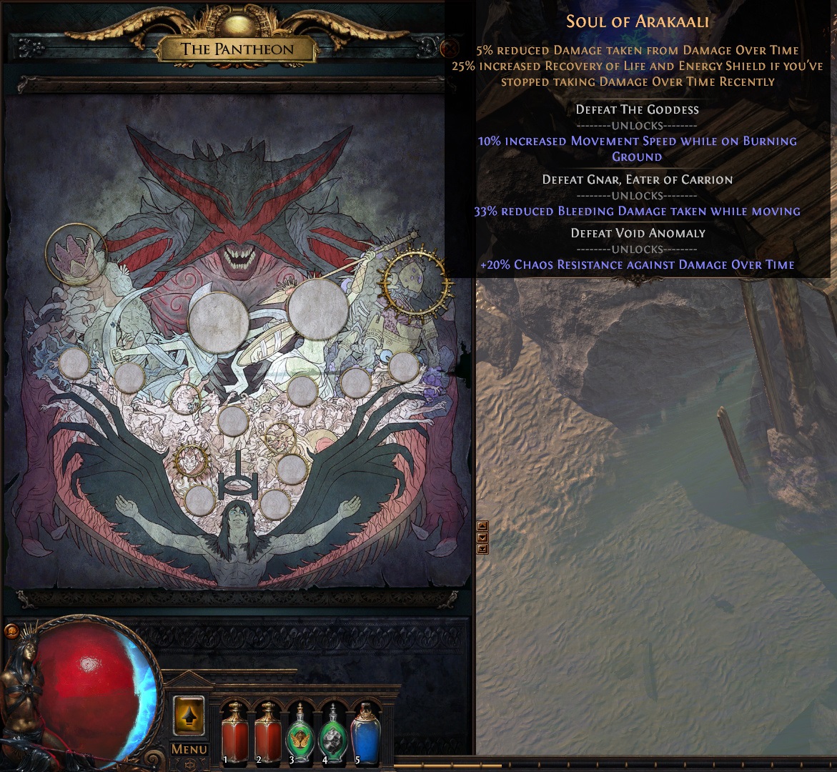 Пантеон - это система божественных сил, которые дают различные бонусы вашему персонажу. Эти способности Богов, доступны только после того как вы убьёте того или иного Бога в второй части сюжетной линии игры. Силы богов могут быть усилены захватом душ боссов на картах.