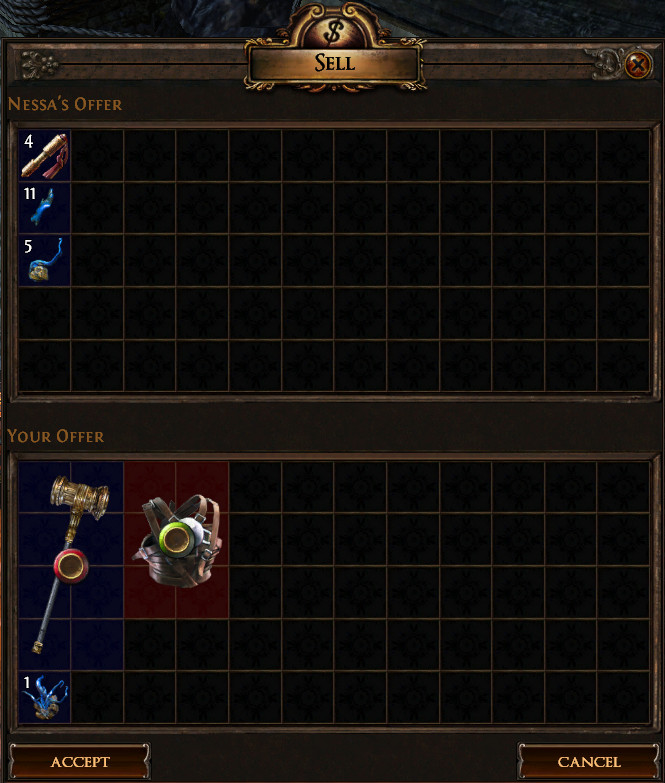 Компоненты должны быть одного типа (например, Ошибка Lua: Error: invalid field alias "items._pageName"; aliases cannot contain dots or quotes..). уровень получаемого предмета зависит от наименьшего уровня предмета из предложенных на обмен. Если все предметы волшебные, то получаемый предмет будет волшебным и неопознанным. | |