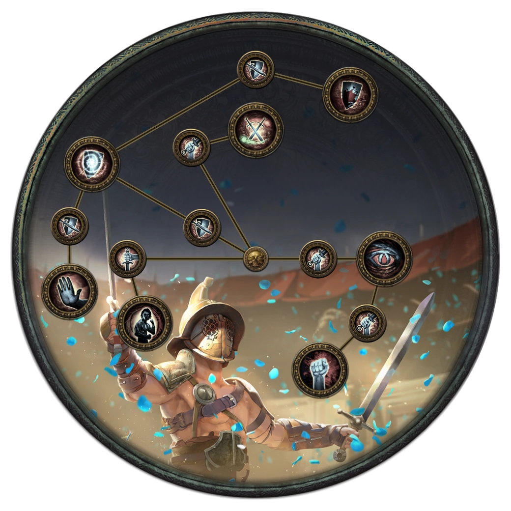 The Gladiator is an Ascendancy class with a mixture of speed, power, and protection, revolving around certain stats. It covers two primary niches, one which is focused around maximizing block effectiveness, and another which enhances bleed with auxillary effects. The class also covers dual wielding and Blood Stance and Sand Stance bonuses.