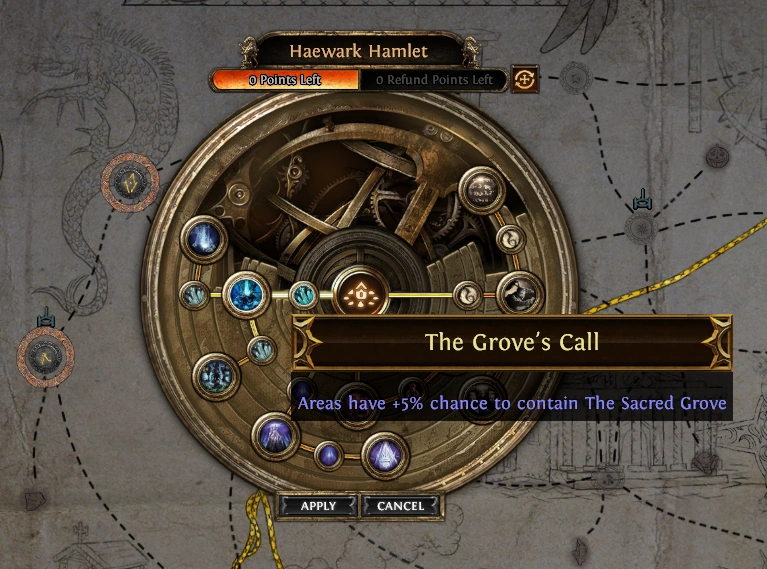 We select The Grove's Call which grants us increased frequency of Harvest encounters within maps (The Sacred Grove), and then press Apply to confirm our selection.