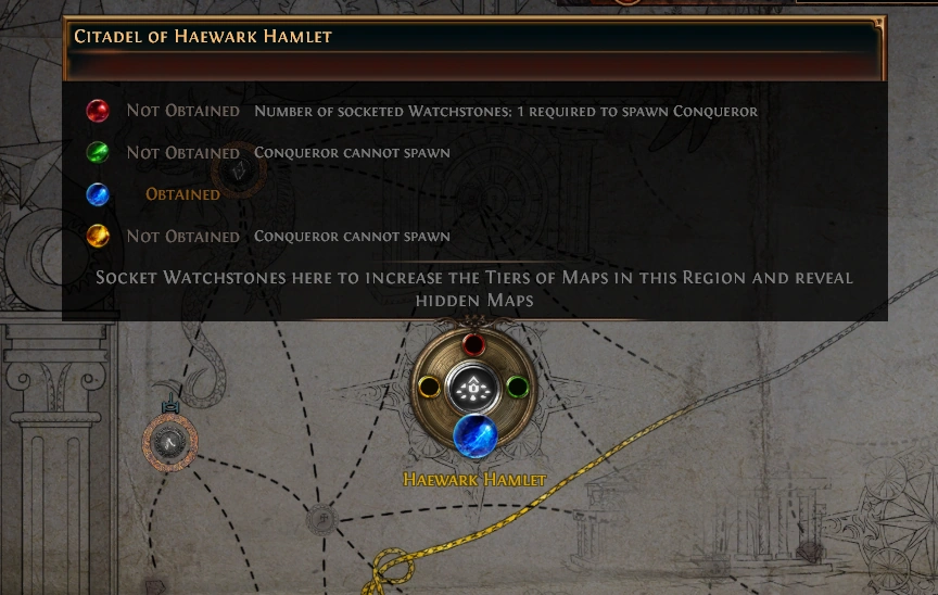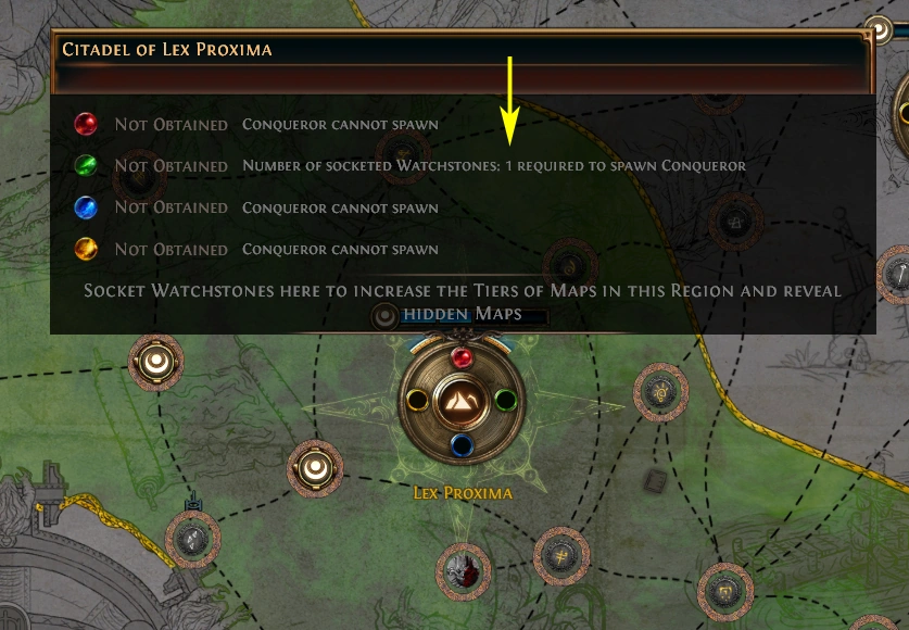 For each cycle of 4 Conquerors you defeat, you will need 1 more watchstone socketed. Hovering over the storage sockets on the left of the atlas, or over each citadel will display which watchstones you still need to obtain in each region, and how many watchstones must be socketed to spawn each Conqueror. |