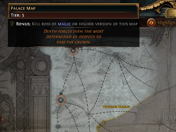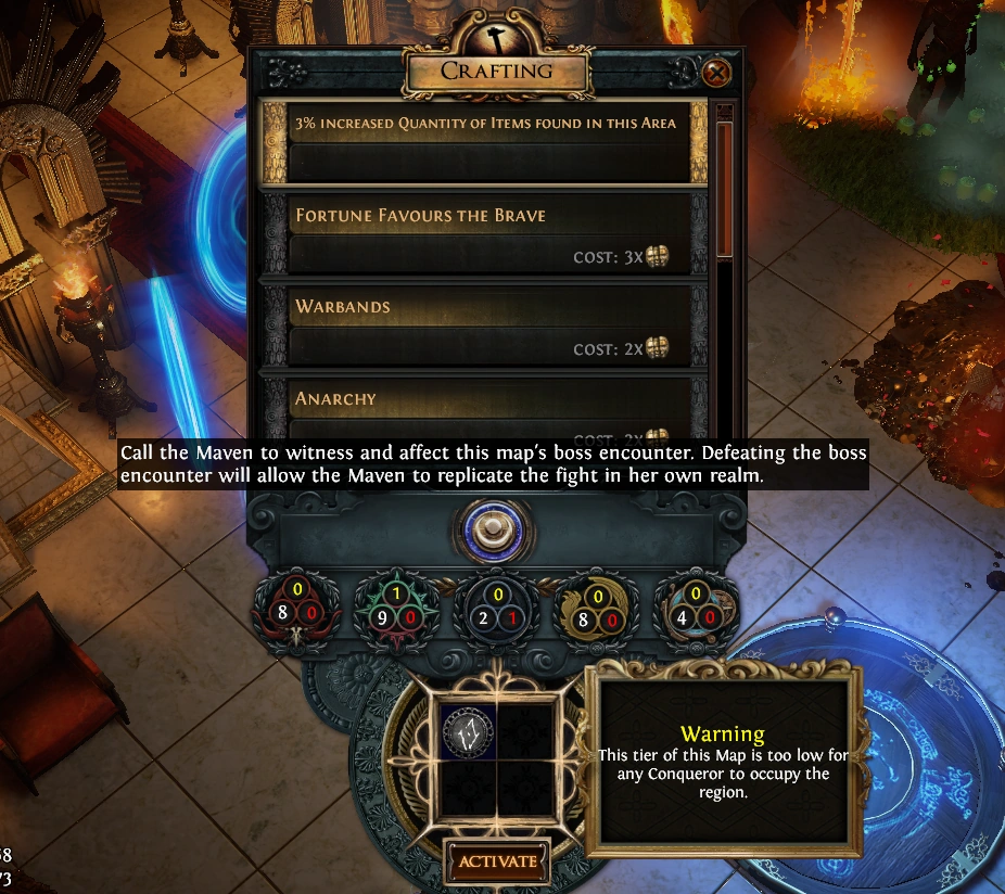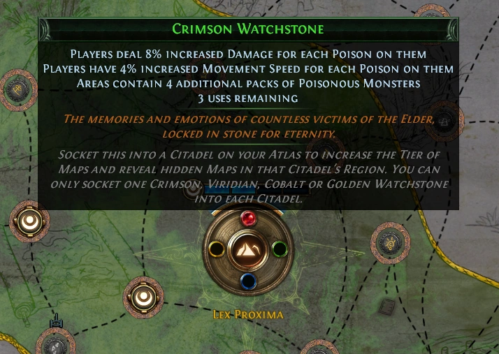 To do this, craft 5-10 maps at a time from a single region. Make them at least Rare if you cannot yet run Corrupted Rare. Before running the maps, roll over the region's citadel in the Atlas and ensure you have the correct number of watchstones socketed (the best is to have 4 watchstones socketed). If you have less watchstones, take it out from other regions and place it into this one. Tip: Socket in 4 watchstones in a region's citadel before running yellow/red maps in that region, in order to obtain higher tier maps within that region. |