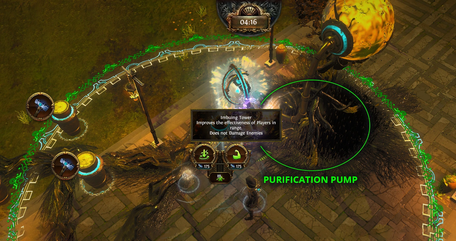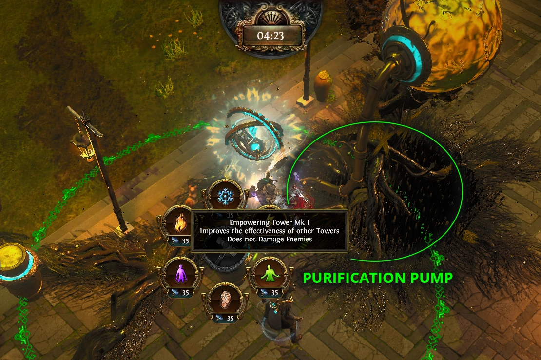 The first thing to do is build an Empowering Tower near to the Purification Pump.