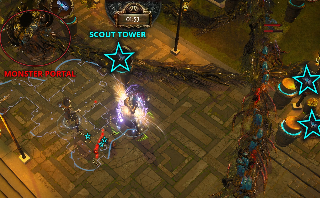 When this happens, you'll see many more Monster Portals appear and many more red dots (monsters) on your map. The goal is to place down Scout Towers on the junction points so that they can target monsters moving along multiple lanes. The map shows the recommended locations for Scout Towers with Stars. |