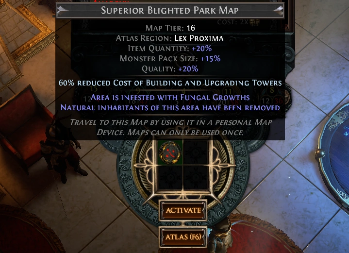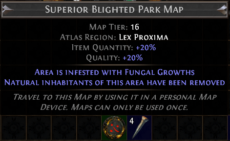 Warning: A rare map with more modifiers provides more rewards, but also greatly increases the difficulty of the combat and you will need 20 million+ DPS to properly defeat it, therefore for learning just run a normal rarity map. To prepare your blighted map, first use an Lua error: Error: invalid field alias "items._pageName"; aliases cannot contain dots or quotes.. on it if it is not normal rarity. After you have defeated at least one normal map, try a magic map, then rare, then finally a corrupted rare map for the maximum rewards. Then use 4 Lua error: Error: invalid field alias "items._pageName"; aliases cannot contain dots or quotes..s to add 20% quality. |