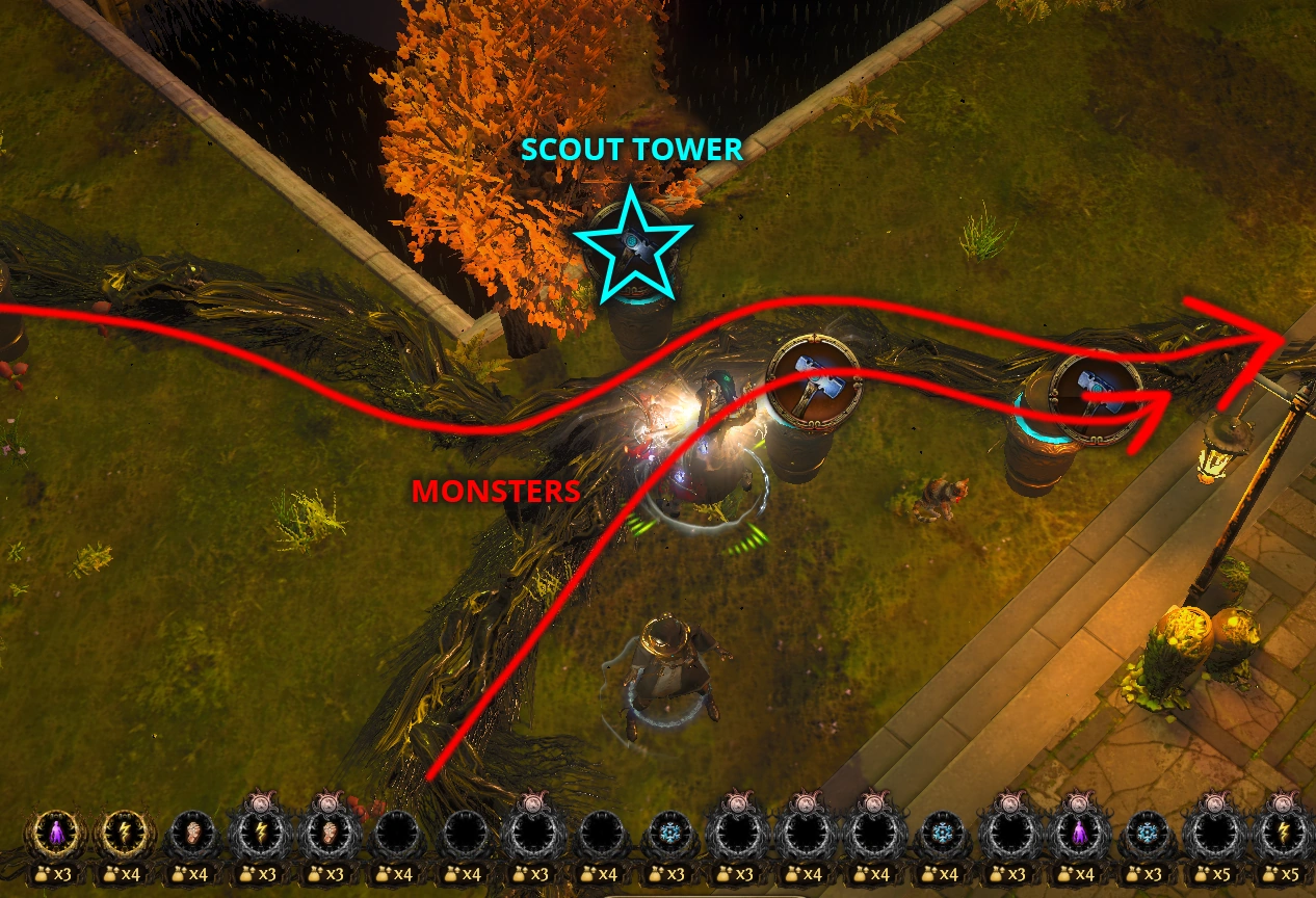 As you can see, monsters on the right are moving upward, so we need to build at least 2 Scout Towers next to the lane to tackle them.