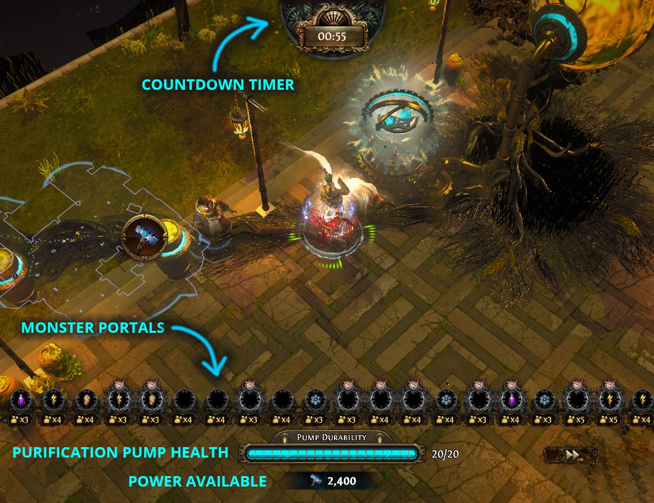 You will be expected to deal a high amount of single-target damage for the mini bosses that spawn, as the towers may damage them but often fail to kill them. Constantly return to the center and kill any monsters near the Pump.
