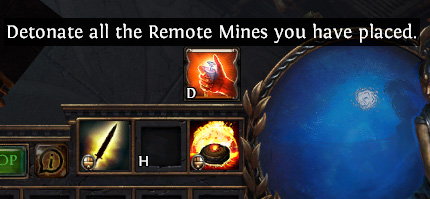 A mine (or remote mine) is a type of active skill that throws a device that can be detonated remotely to produce an effect such as delivering a spell payload, launching a volley of arrows, or teleporting the user to that location.
